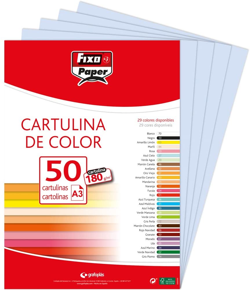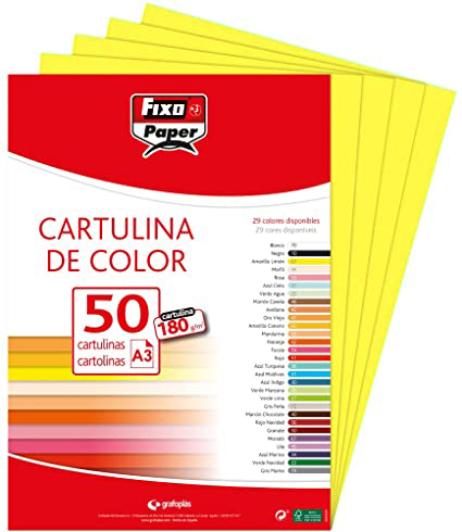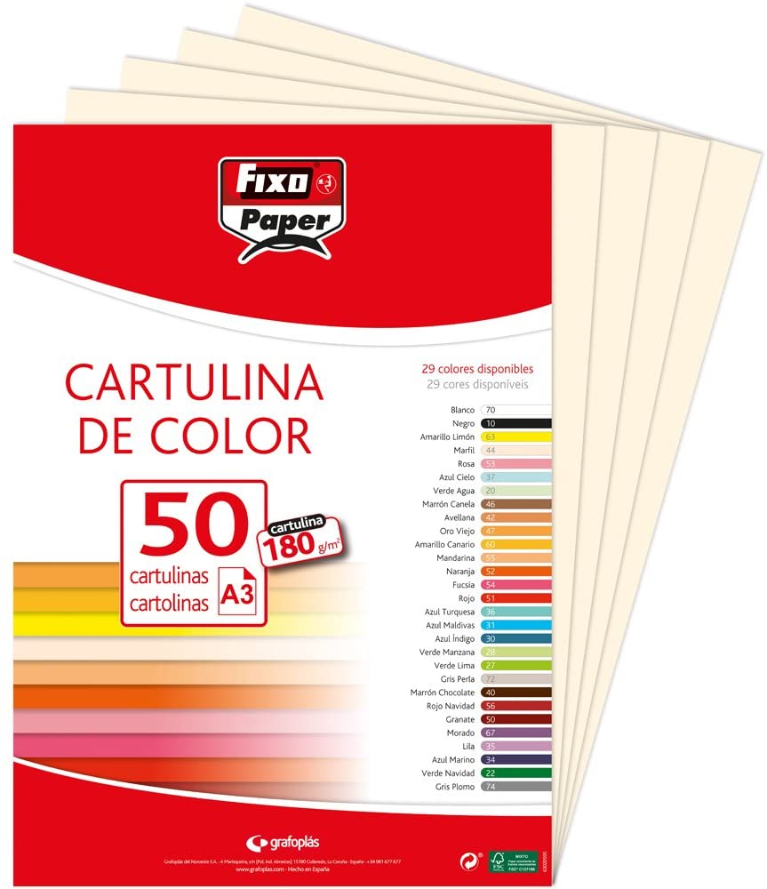 Paquete de 50 cartulinas A-3 de 180 gr - Ligeramente satinadas y coloreada en tono rojo - Se puede utilizar en cualquier tipo de impresora - Ideal para uso escolar - Marca Fixo Ref 140194